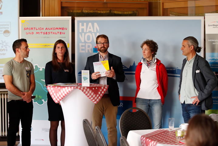Die Broschüre des Fachbereichs Sport und Bäder der Landeshauptstadt Hannover, der SportRegion Hannover sowie der Koordinierungsstelle Sport und Geflüchtete in Hannover des VfL Eintracht Hannover trägt den Titel „Sportlich ankommen und mitgestalten“. Sie zeigt Teilhabemöglichkeiten am Sport für Neubürger auf und unterstützt die vielen Ehrenamtlichen in ihrer alltäglichen Arbeit in Sportvereinen und anderen Bereichen der Stadtgesellschaft. Sie enthält unter anderem einen Überblick über das Sportsystem, gerade in Bezug auf die örtliche Situation in Stadt und Region Hannover, und stellt Ansprechpartner und Fördermöglichkeiten vor.