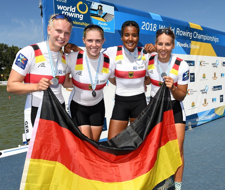Der Frauen-Doppelvierer mit Marie-Cathérine Arnold (Hannoverscher Ruder-Club von 1880 e.V.), Carlotta Nwajide (Deutscher Ruder-Club von 1884 e.V.), Franziska Kampmann (Ruderverein Waltrop von 1928 e.V.) und Schlagfrau Frieda Hämmerling (Rudergesellschaft Germania e.V. Kiel) hat den zweiten Platz bei der Ruder-Weltmeisterschaft 2018 gewonnen. am Ende nur den neuen Weltmeisterinnen aus Polen geschlagen geben.
