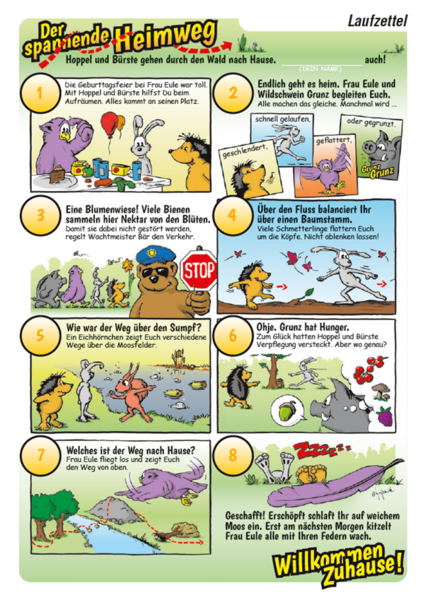 Die Kinder werden mit Hilfe der Materialienmappe auf den spannenden Heimweg mitgenommen und für kognitive Herausforderungen begeistert. Eine solche Einladung zur Bewegung schon in frühestem Alter ist wichtig, weil die Lebenswelt vieler Kinder diese Gelegenheiten heute nur noch selten bietet.