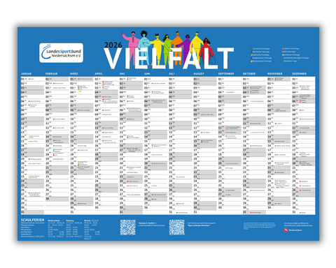 Auch für das Jahr 2026 gibt es wieder den LSB-Vielfaltskalender! Neben den Schulferien sind wichtige Feiertage verschiedener Religionsgemeinschaften sowie besondere Thementage im Bereich "Teilhabe und Vielfalt" markiert, z.B. der Internationale Tag gegen Rassismus oder der Internationale Tag der Menschenrechte. Verfügbar ist er in den Formaten A1 und in A3.